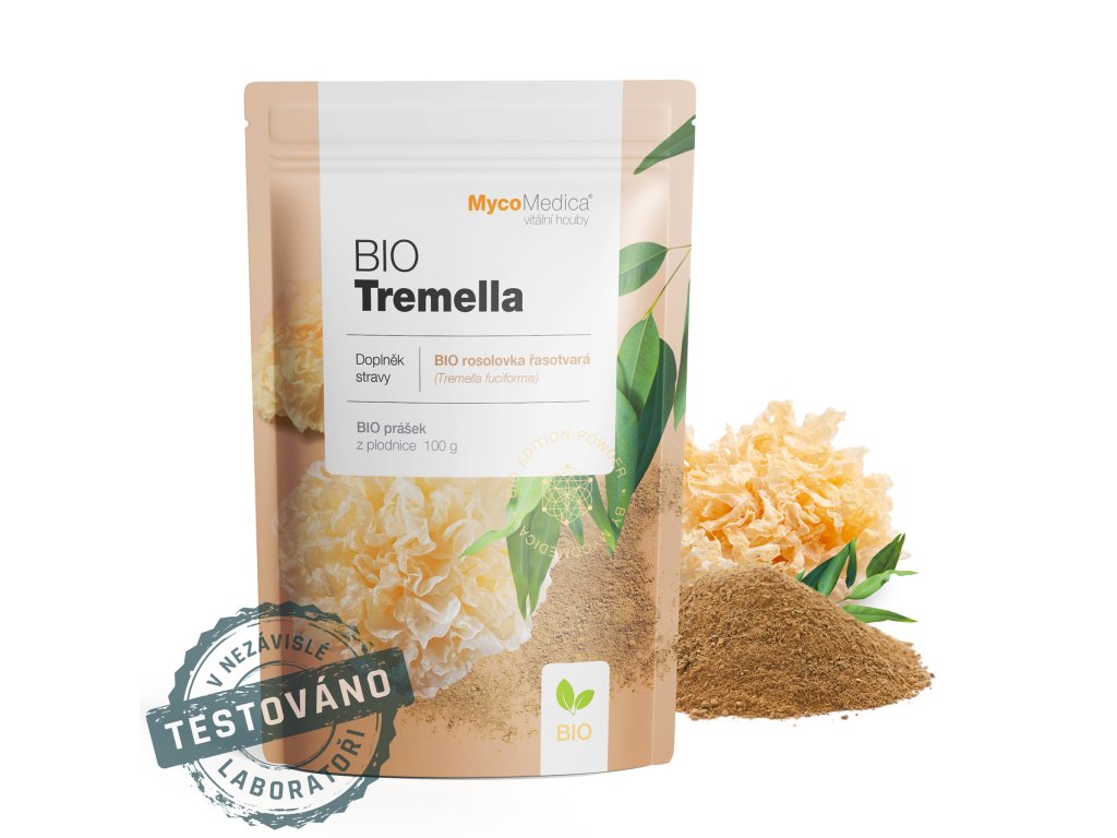 MycoMedica nabízí Tremellu ve formě houbového prášku (powder/biomasa), kdy se usušená plodnice houby rozemele na velmi jemný prášek speciální metodou shellbroken, při které dojde k narušení chitinového obalu buňky a uvolnění účinných látek. Oproti extraktu má tato forma jemnější působení.