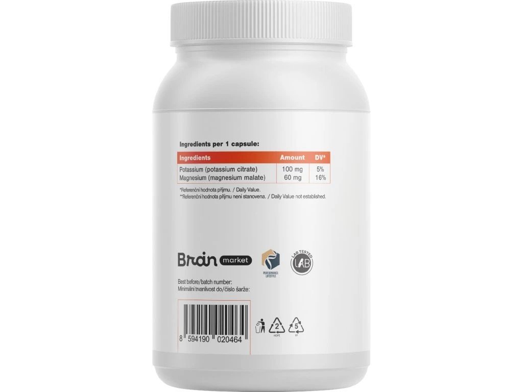Každá kapsle obsahuje 100 mg elementárního draslíku a 60 mg elementárního hořčíku, bez plnidel, aditiv a éček. Čisté složení, maximální využitelnost a bezpečnost potvrzená antidopingovými testy.