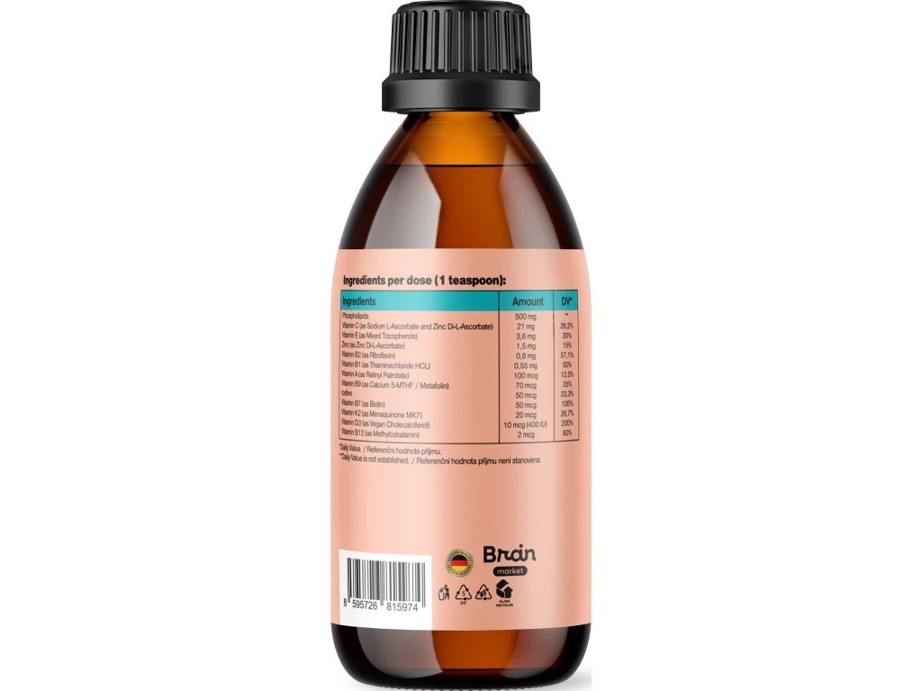 Dětský organismus během růstu potřebuje optimální dávky živin pro správný vývoj mozku, kostí i imunity. Tento lipozomální multivitamín v tekuté formě kombinuje 30 bioaktivních vitaminů a minerálů ve vysoce vstřebatelné podobě. Vitamin C a zinek podporují imunitní systém, vitaminy B1, B2 a B12 přispívají k metabolismu energie a správné činnosti nervové soustavy, zatímco vitamin D3 a K2 zajišťují zdravé kosti a zuby.