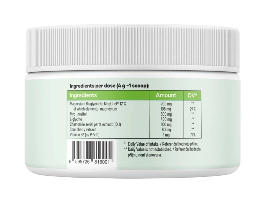 Bisglycinát hořečnatý MagChel® (900 mg, RHP **), z toho elementární hořčík (108 mg, RHP 29 %), stabilizátor: kyselina citronová, myo-inositol (500 mg, RHP **), L-glycin (400 mg, RHP **), lyofilizovaný broskvový prášek, přírodní aroma, agáve inulin, barvivo: extrakt ze světlice barvířské, heřmánek extrakt z natě (10:1) (100 mg, RHP **), extrakt z višně (80 mg, RHP **), vitamín B6 jako P-5-P (1 mg, RHP 71 %).