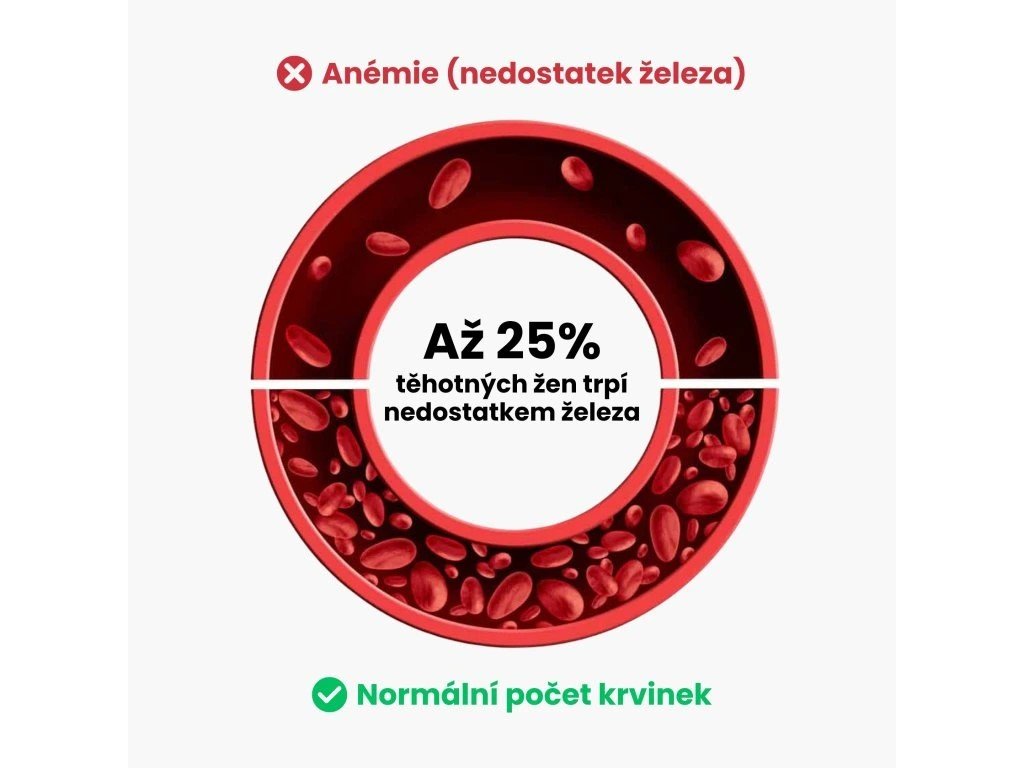 Zajišťuje dostatek železa a kyseliny listové – klíčových složek pro zdravý krevní oběh, tvorbu červených krvinek a správný růst plodu.