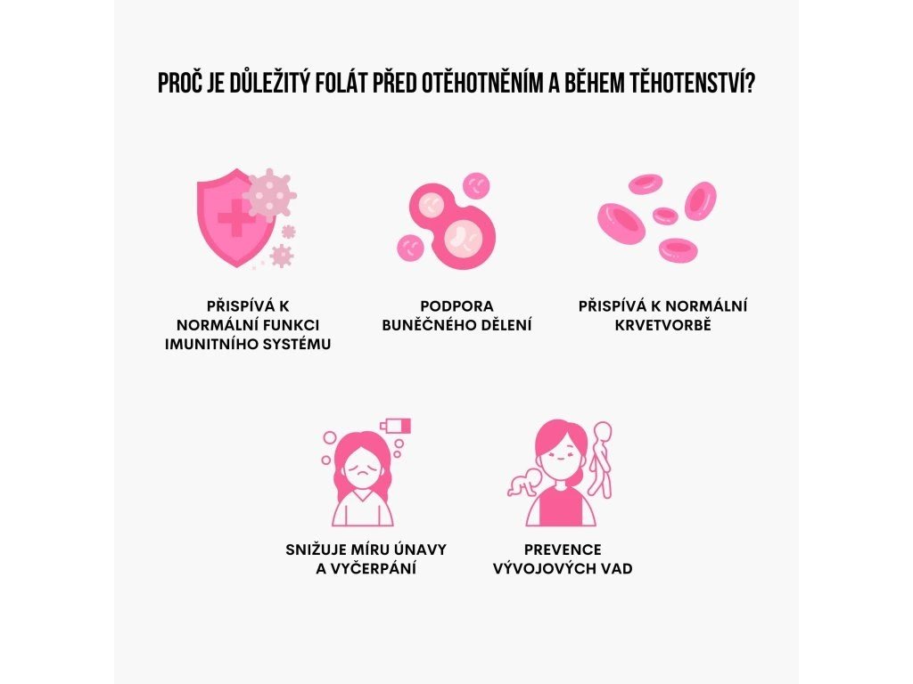✔️ Bioaktivní kyselina listová (methylfolát) – zásadní pro buněčné dělení a vývoj nervového systému miminka. Až 50 % žen nedokáže klasickou kyselinu listovou správně využít, proto je aktivní forma jistotou.