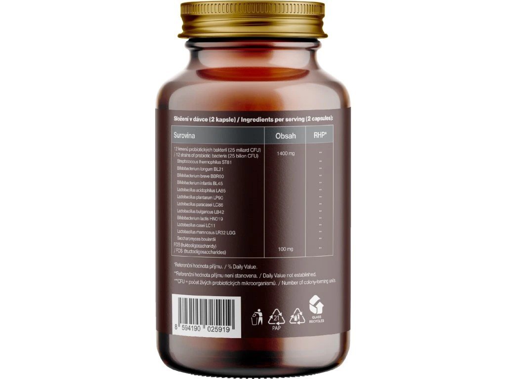 Každá dávka (2 kapsle) obsahuje 25 miliard živých kultur z pečlivě vybraných bakteriálních kmenů.