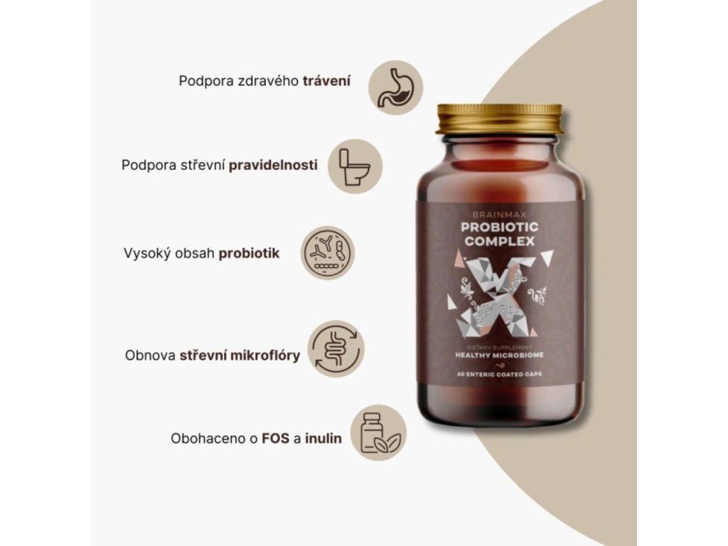 BrainMax Probiotic Complex pomáhá obnovit přirozenou rovnováhu a podpořit střevní bariéru, vstřebávání živin a odolnost vůči stresu.