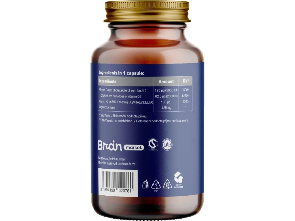 BrainMax Vitamin D3 & K2 je doplněk stravy, který spojuje dvě klíčové mikroživiny s bio kurkumou. Vitamin D3 přispívá k normálnímu vstřebávání vápníku a fosforu, čímž podporuje udržení normálního stavu kostí, svalů a zubů. Vitamin K2 v patentované formě MK-7 K2VITAL® DELTA navíc přispívá k normální srážlivosti krve a udržení normálního stavu kostí.