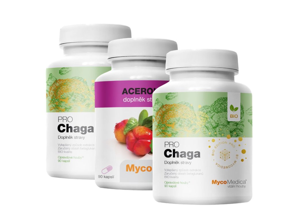 Tato sada obsahuje dvě balení MycoMedica Chaga PRO a jedno balení kapslí Aceroly a je určena pro dlouhodobé a systematické užívání.