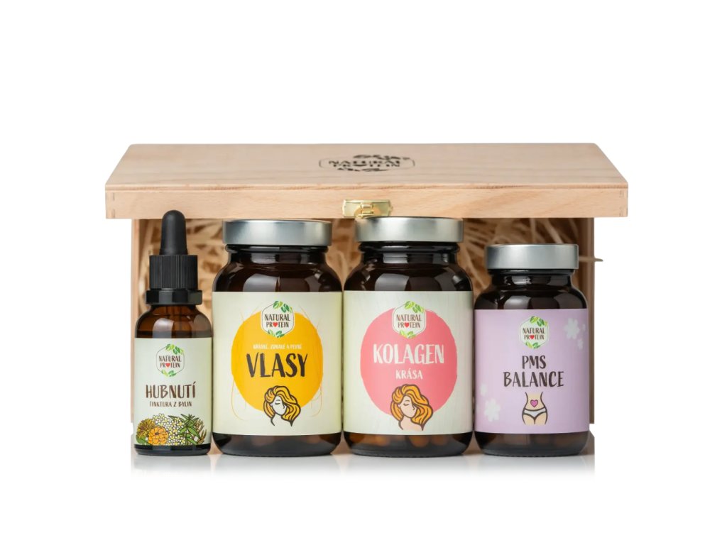 Zvýhodněný dřevěný box NaturalProtein Krásná a sebevědomá spojuje čtyři přírodní doplňky, které myslí na potřeby ženského těla v každé fázi života. Pomáhá podpořit vlasy, pleť, nehty, hormonální rovnováhu i vitalitu.
