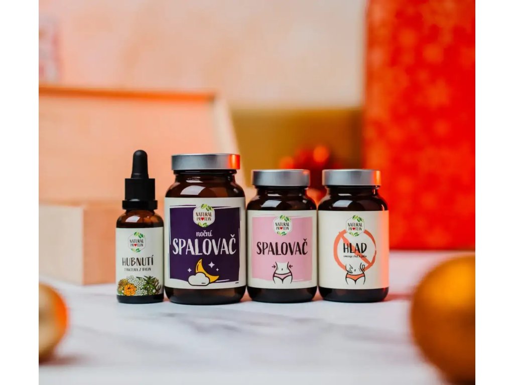 4️⃣ Tinktura Hubnutí (30 ml) – bylinné kapky s pěti extrakty, které podporují přirozené spalování, odvodnění a vitalitu.*